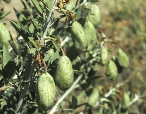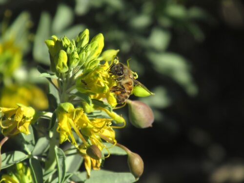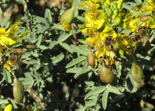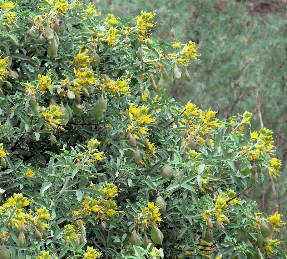 Peritoma or bladderpod. Perennial shrub mostly in southern California by the coast and a bit inland then also in the deserts. In our location yellow flowers in spring then again in fall. The seed pod look like small hanging bladders- hence the common name. Full sun very drought tolerant when established.